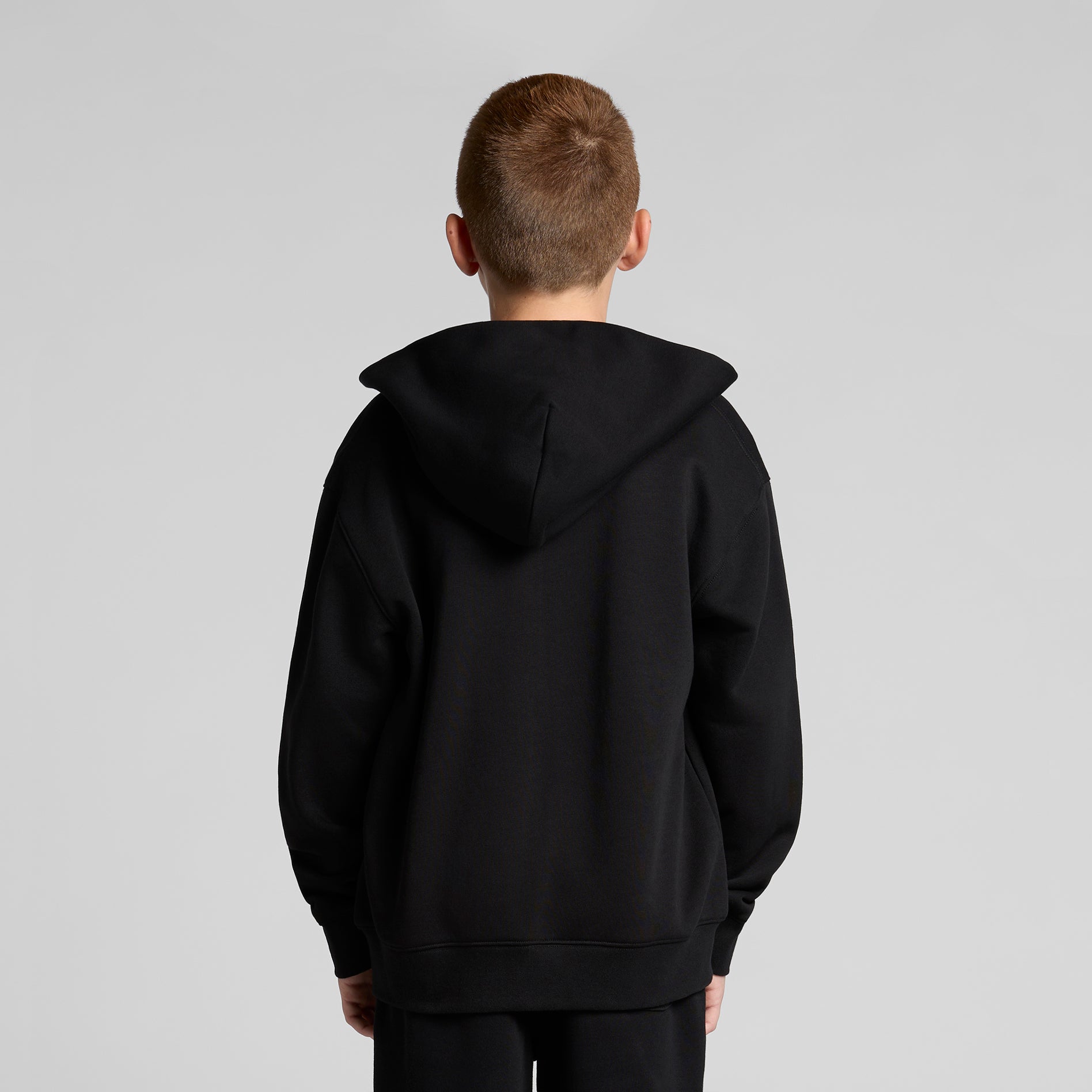 Zip hood, drop shoulder, kangaroo pocket, self-fabric lined hood, no drawcord, YKK zip, sleeve cuff ribbing