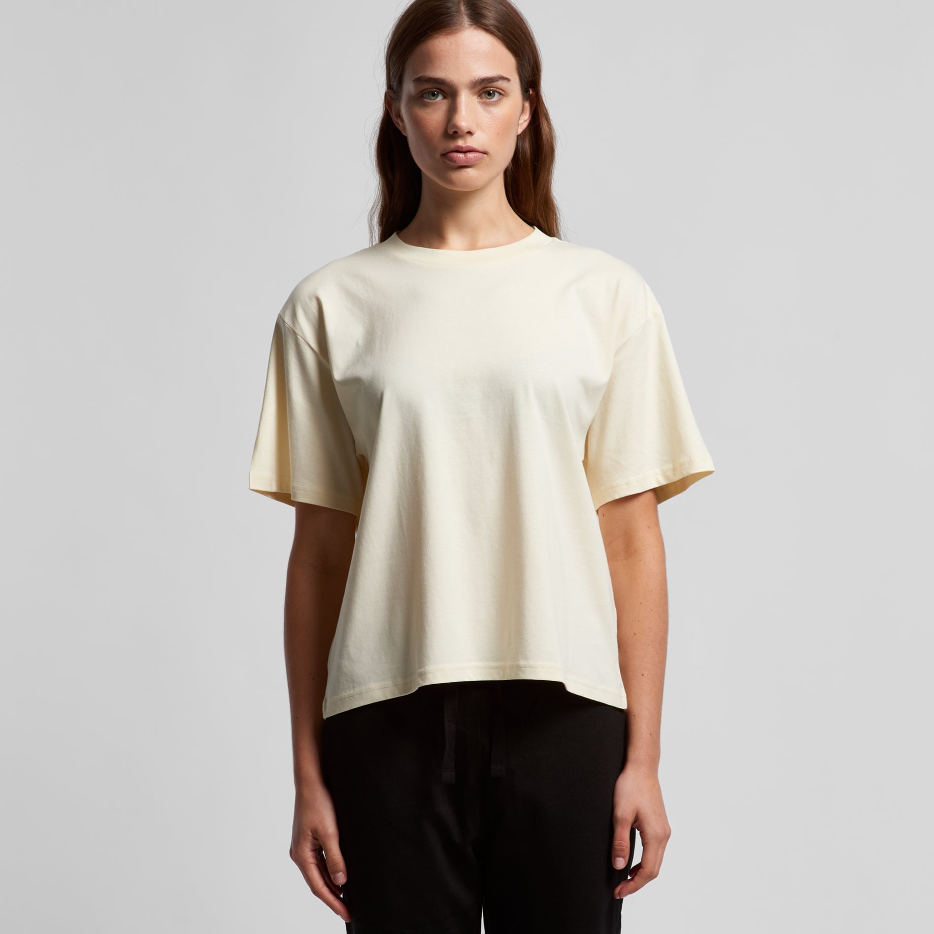 Drop shoulder, mid length, neck ribbing, side seamed, shoulder to shoulder tape, double needle hems, preshrunk to minimise shrinkage