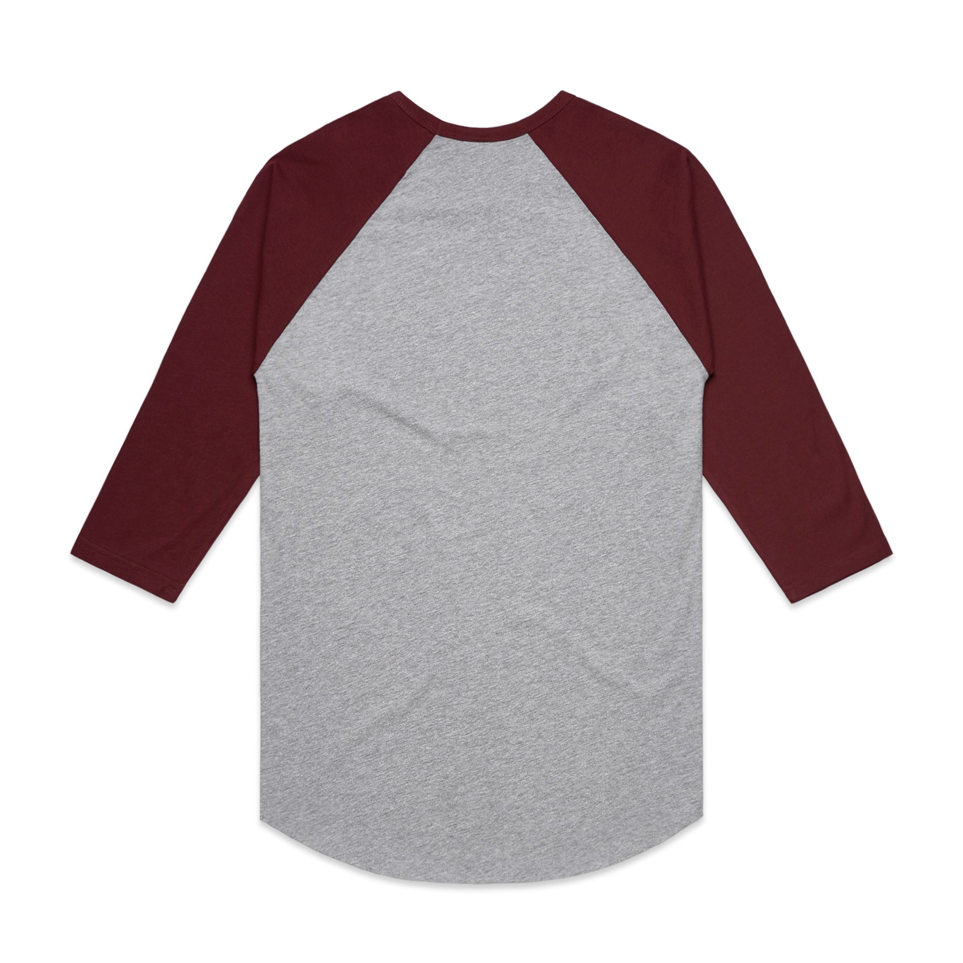 Crew neck, ¾ length raglan sleeves, curved tails, self-fabric binding on neck, side seamed, double needle hems, preshrunk to minimise shrinkage
