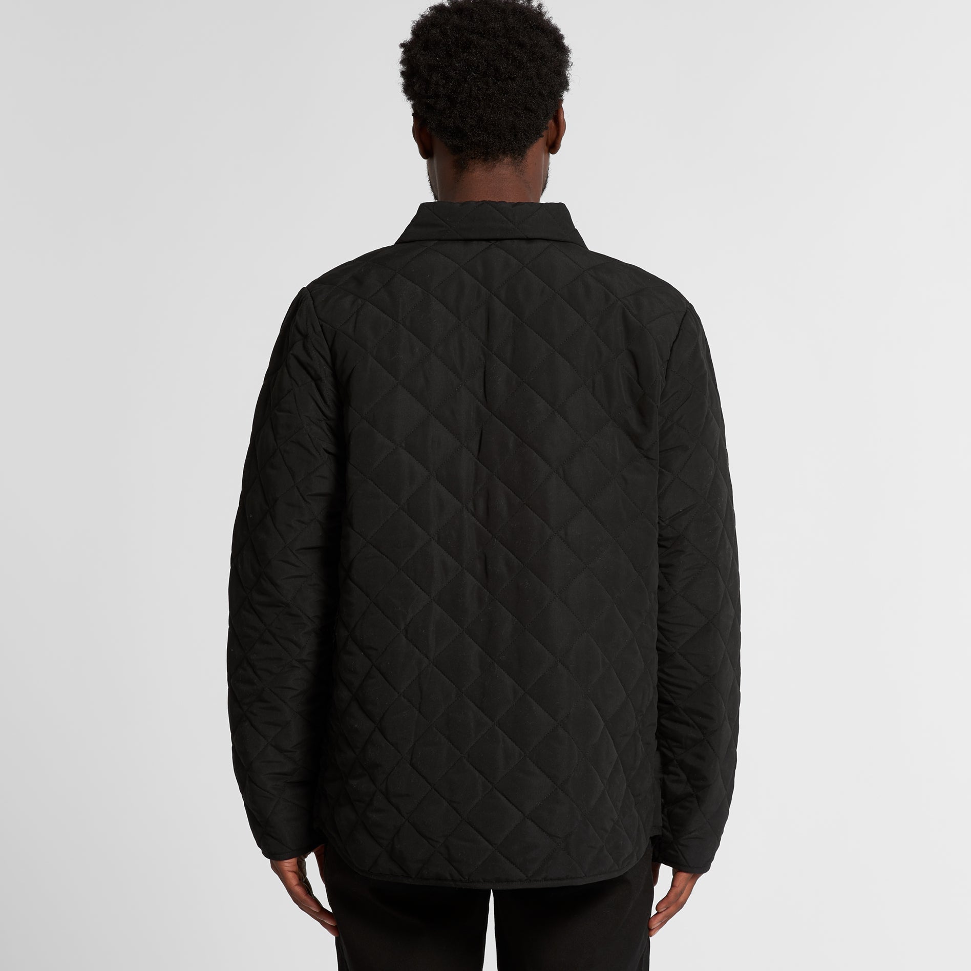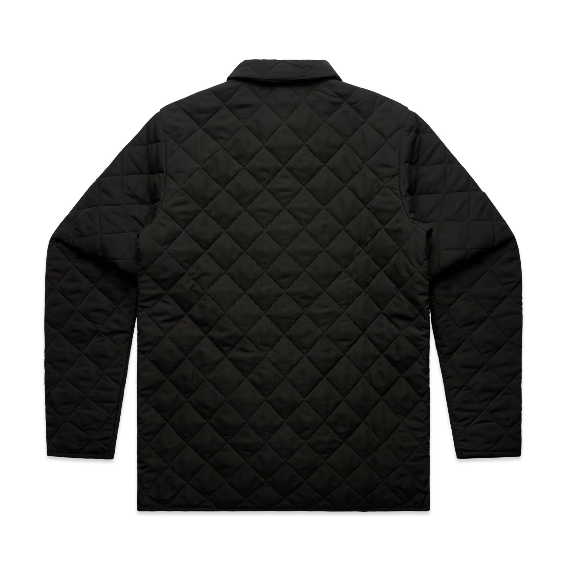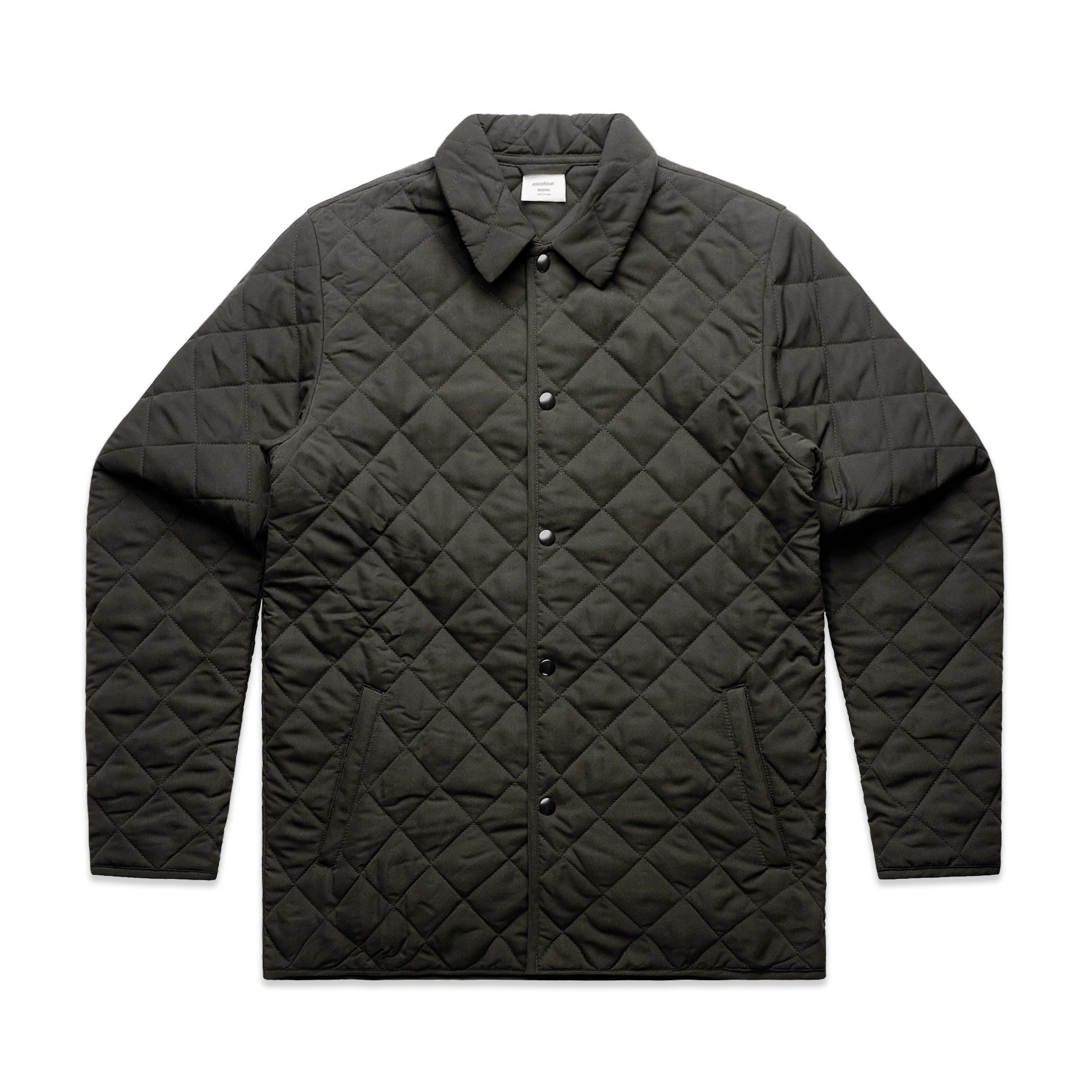 Showcasing the AS Colour Men's Quilted Jacket, featuring 100% recycled polyester wadding. Features a collared design, snap dome closure, and two side pockets. Made sustainably, saving approximately 89 recycled 500ml plastic bottles from landfill.