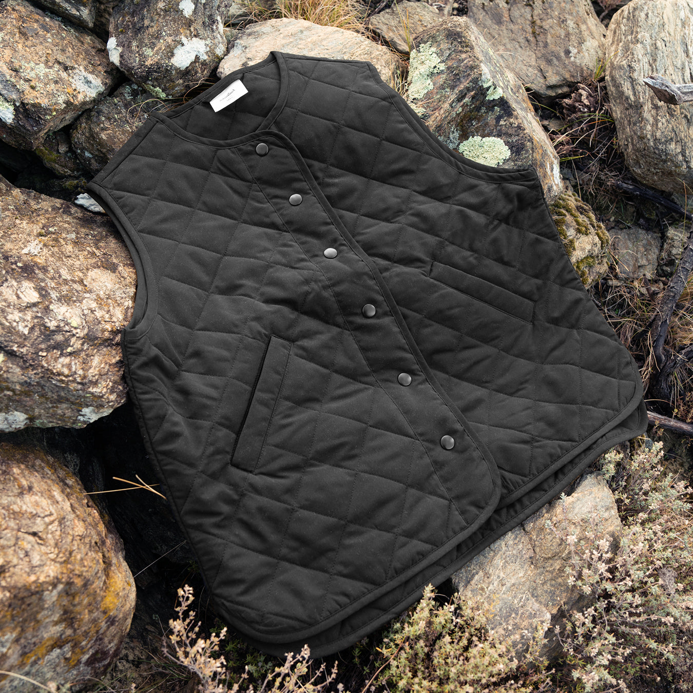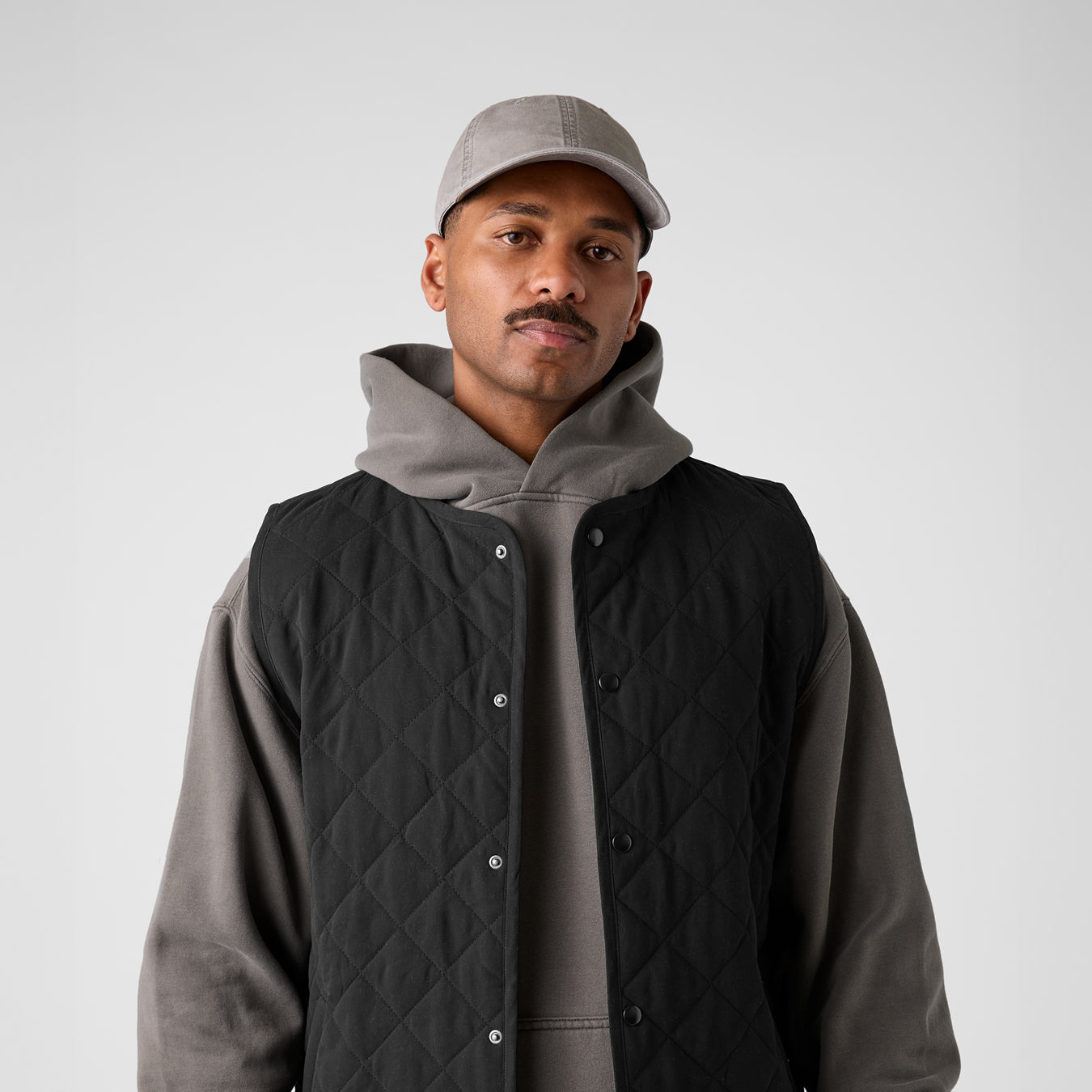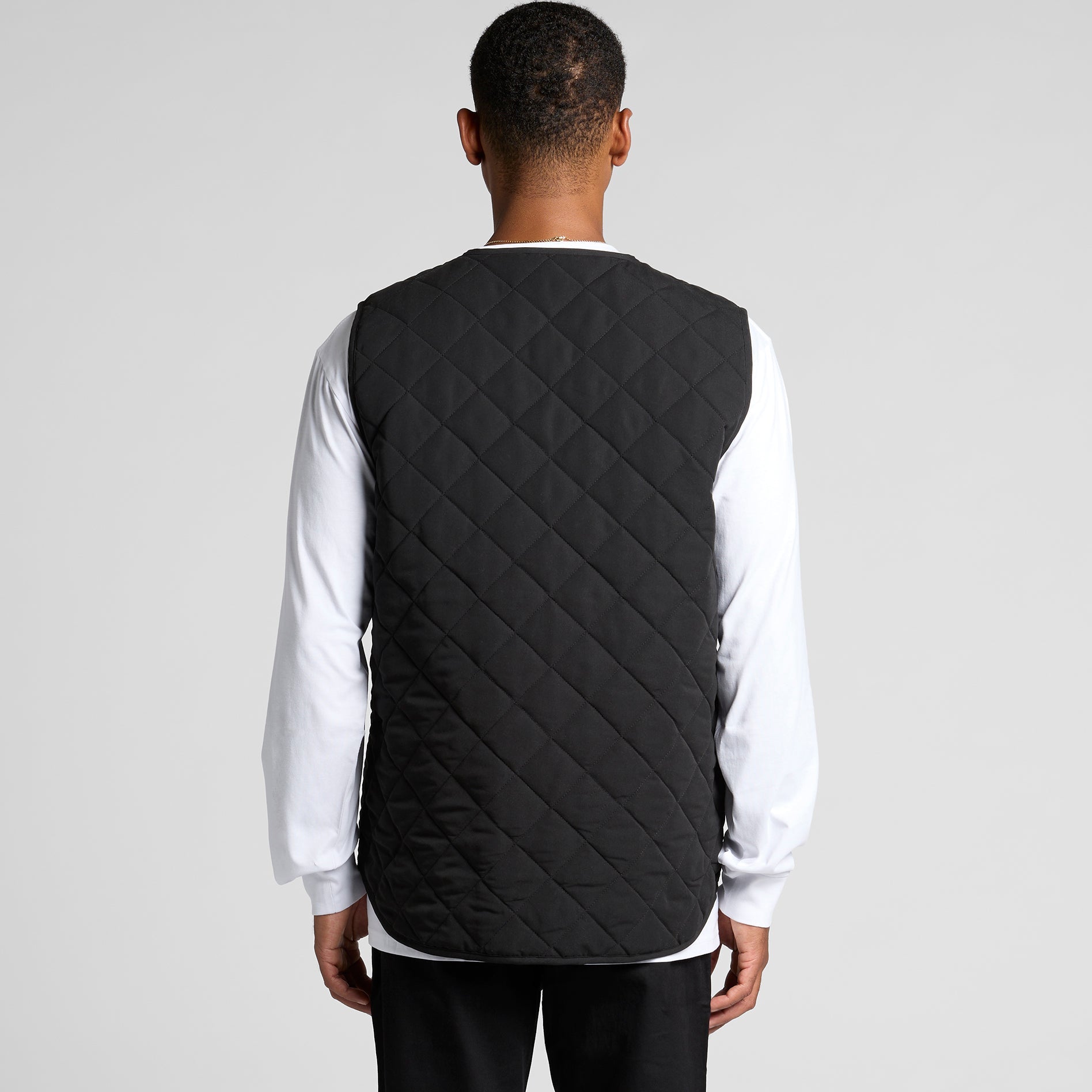 The AS Colour Men's Quilted Vest. Mid weight with a 100% recycled polyester quilted lining & 100% recycled polyester wadding outer. This collarless vest style features two side pockets, a snap dome to close, and a curved hem.