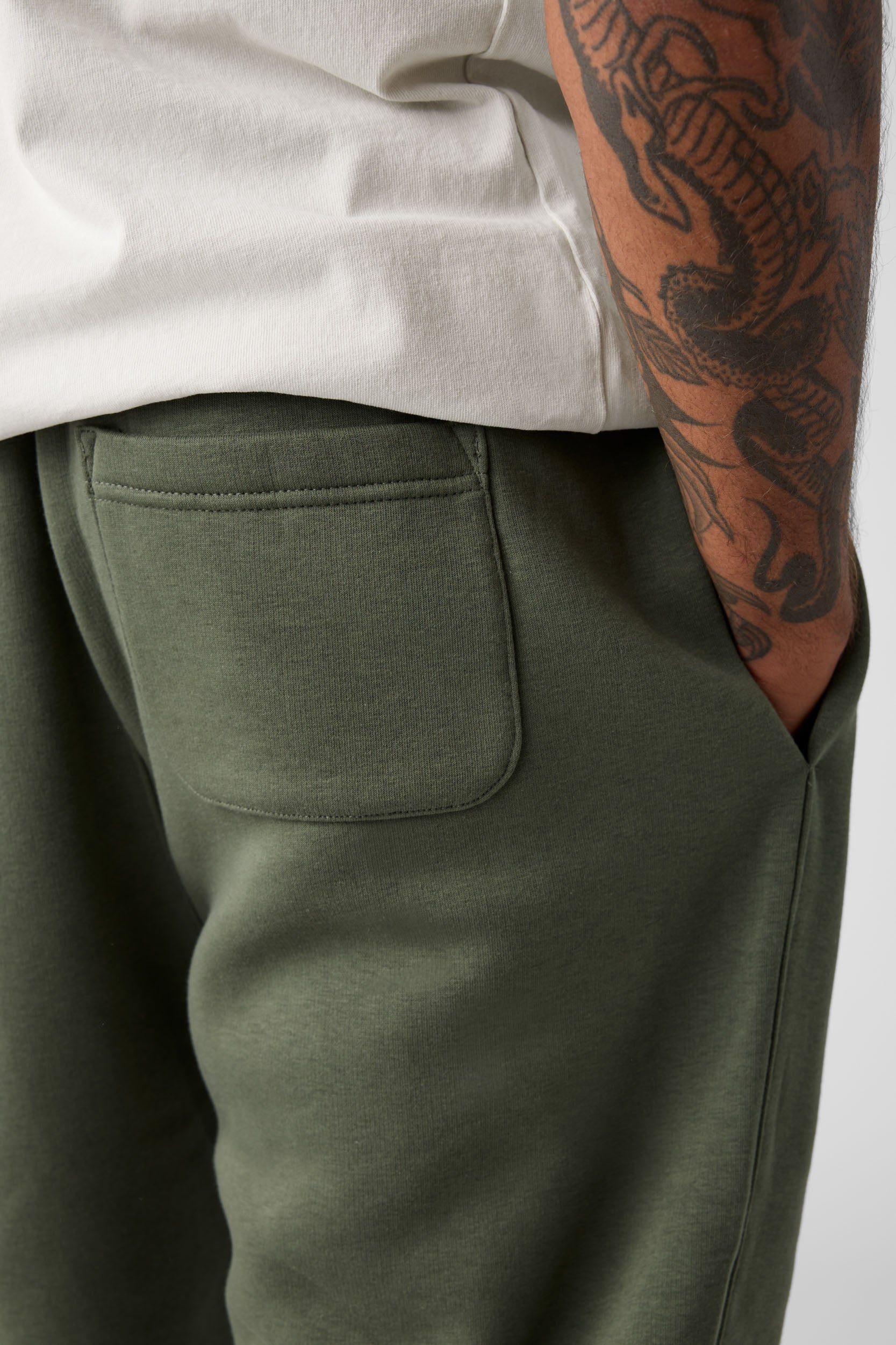 Self-fabric elasticated waistband & hem cuffs, tonal internal drawcord, 2 side pockets, single pocket at back, preshrunk to minimise shrinkage