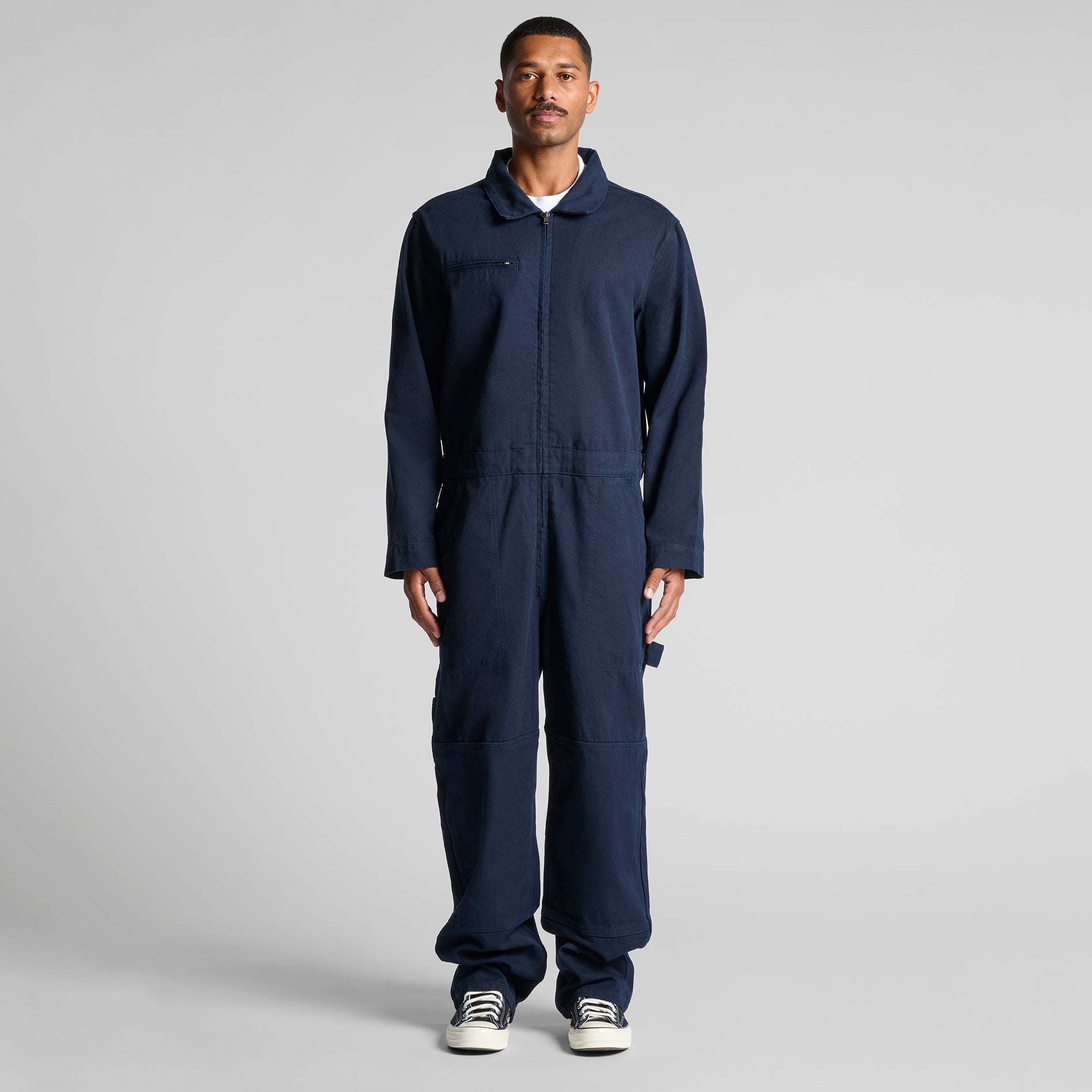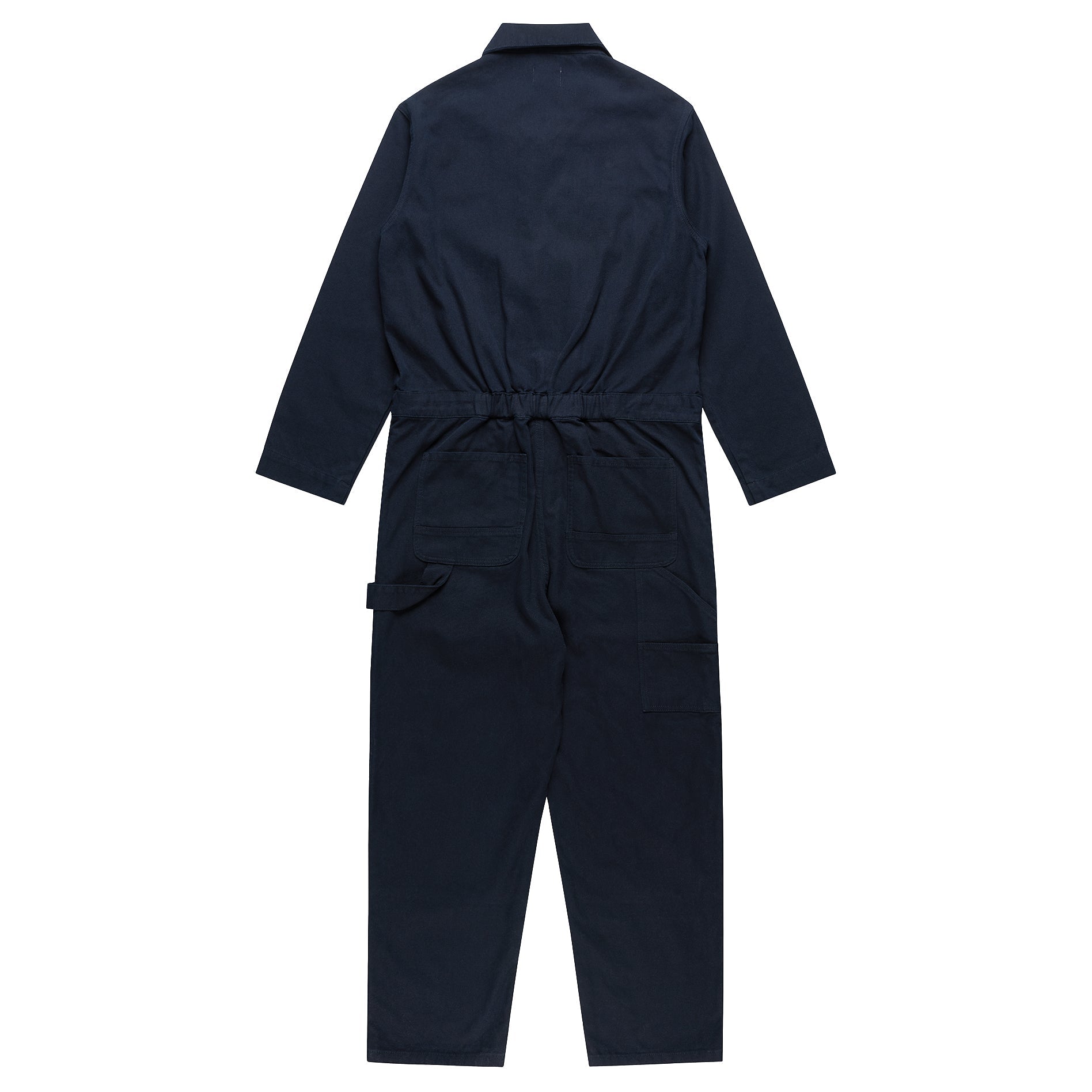 Collared all-in-one, adjustable shoulder straps, YKK zip front, 6 pockets, top stitch detailing, Elastic at centre back, hammer loop, zip close chest pocket, internal access at pocket, double patch knees, preshrunk to minimise shrinkage