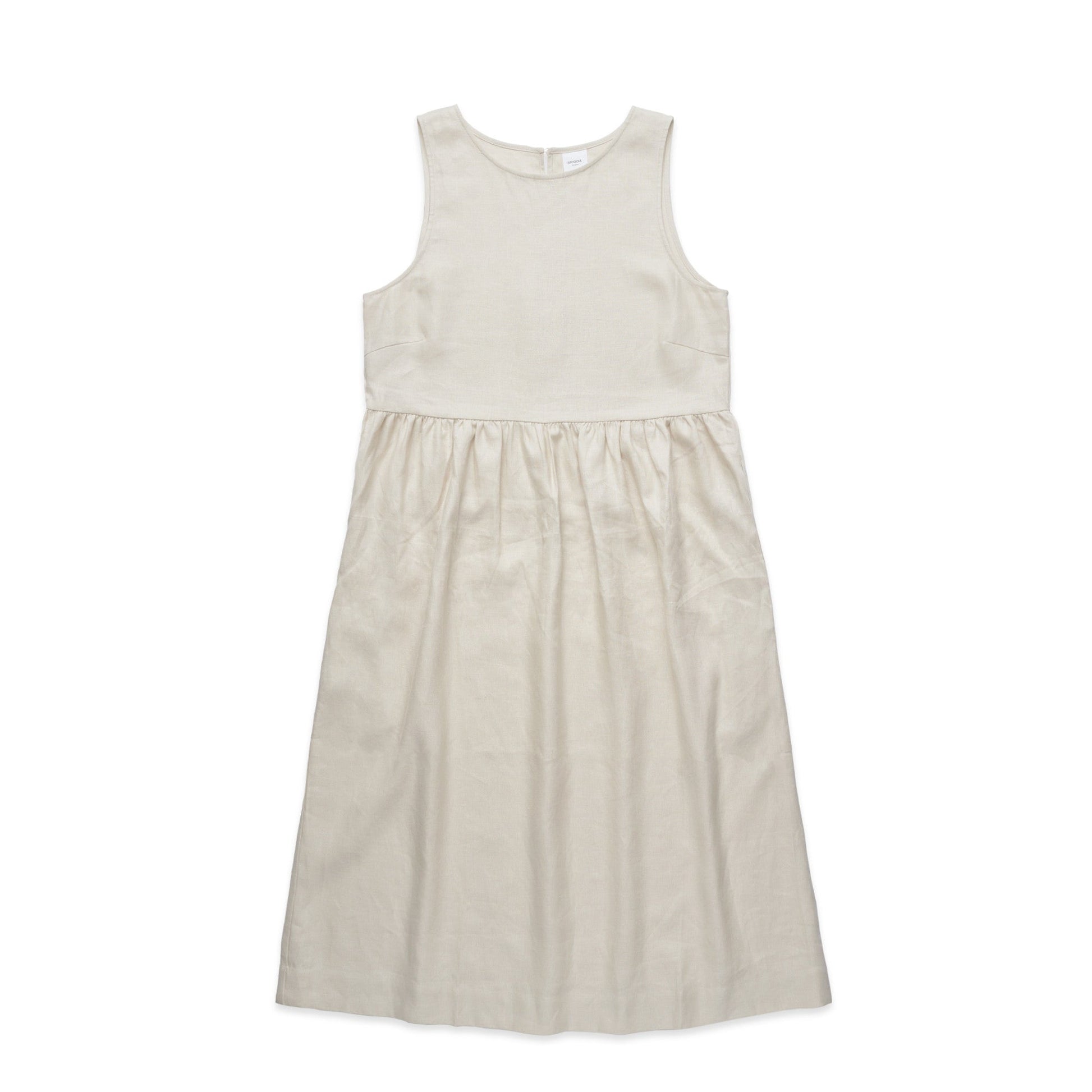 Mid length, sleeveless, back neck button fastening, concealed bindings, gathered at waist seam, side seam pockets